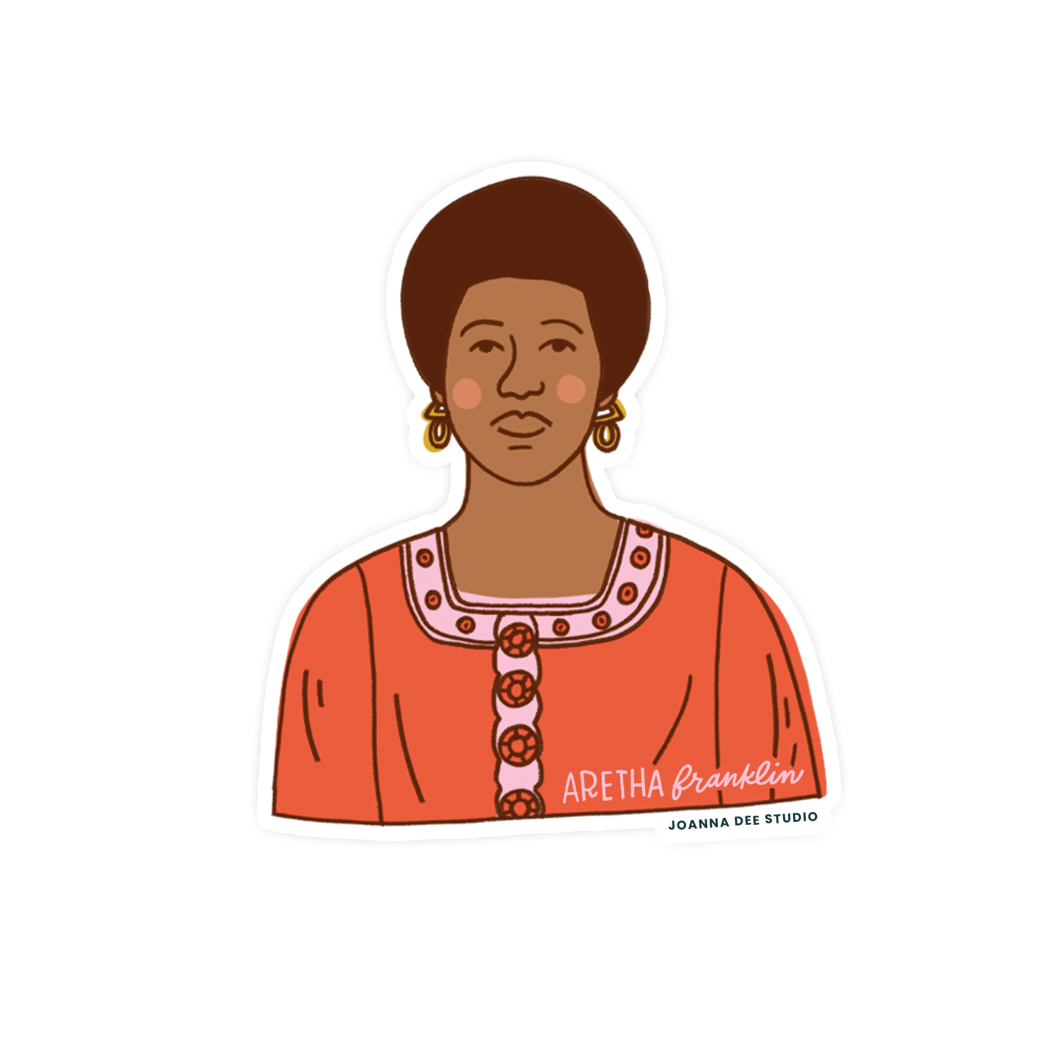 Share your love of the Queen of Soul, Aretha Franklin, with this vinyl sticker. Printed on high-quality matte vinyl that is scratch-resistant and waterproof making this sticker made to last! Brighten up your water bottles, notebooks, computers, and more.