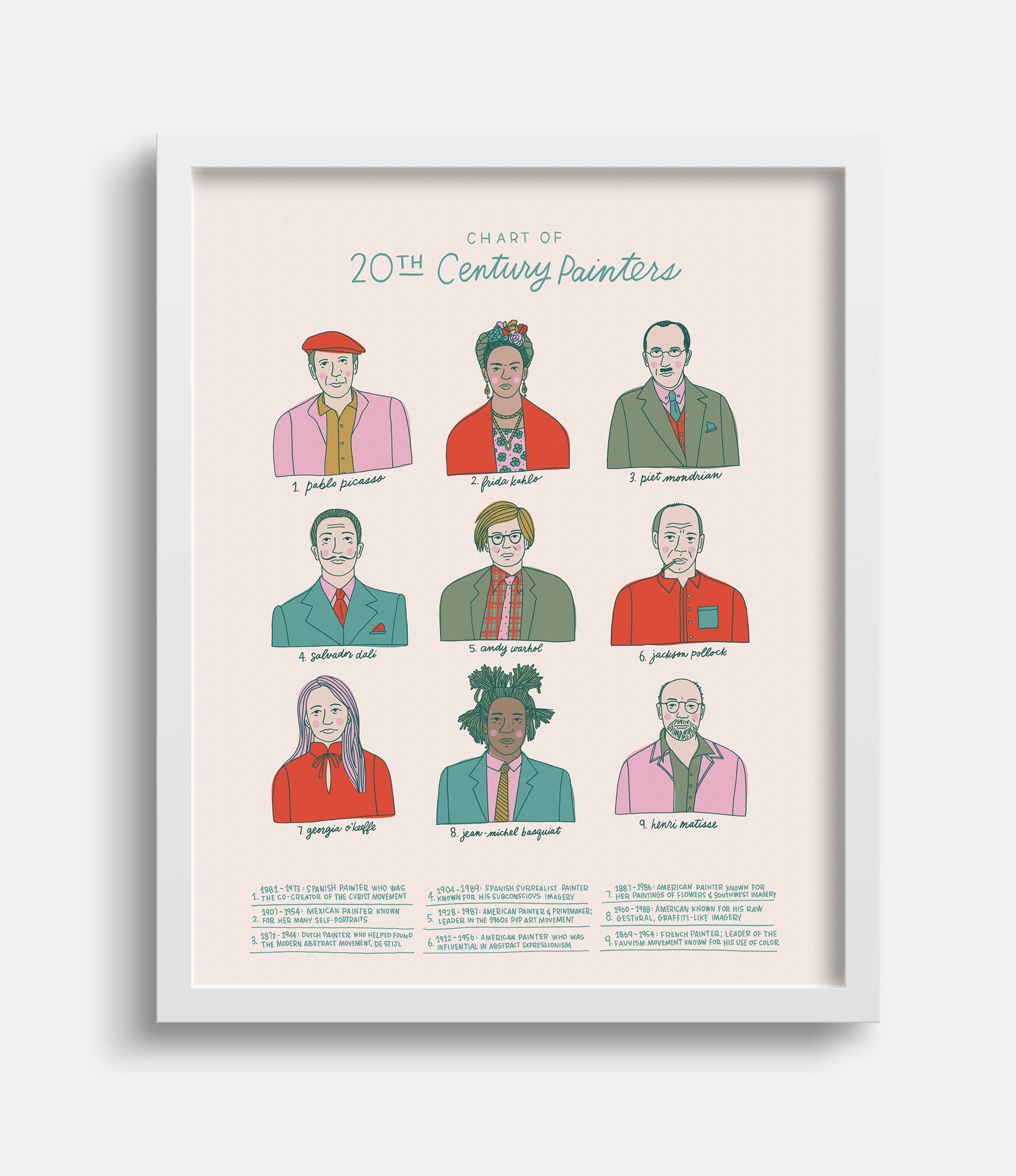 Illustrated chart celebrating painters of the 20th century including brief bios of each artist. Featuring Pablo Picasso, Frida Kahlo, Piet Mondrian, Salvador Dali, Andy Warhol, Jackson Pollock, Georgia O’Keefe, Jean-Michel Basquiat, Henri Matisse.