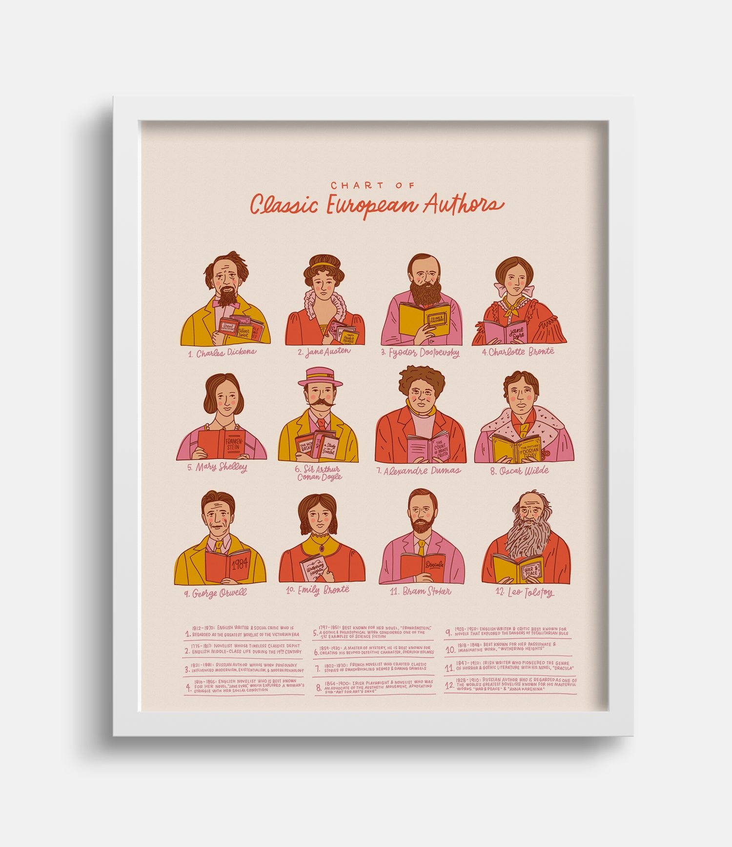 This illustrated chart celebrates the 12 classic European Authors and includes brief bios for each author with illustrations of the author holding one or more of their works. Featuring Charles Dickens, Jane Austen, Sir Arthur Conan Doyle, Leo Tolstoy, Fyodor Dostoevsky, and many more.