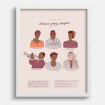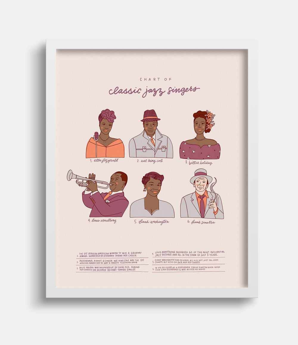 Illustrated Chart of Classic Jazz Singers and highlights from their career. Featuring Ella Fitzgerald, Nat King Cole, Billie Holiday, Louis Armstrong, Dinah Washington, and Frank Sinatra.