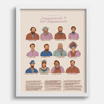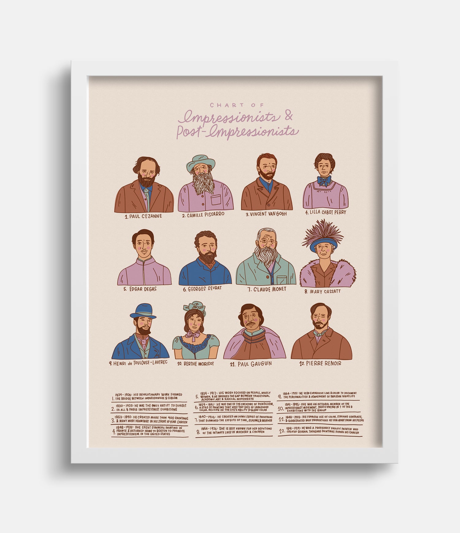 This illustrated chart celebrates the painters of the Impressionist & Post-Impressionist movements including brief bios for each artist. Featuring Vincent Van Gogh, Claude Monet, Berthe Morisot, Edgar Degas, Paul Gauguin and many more.