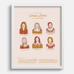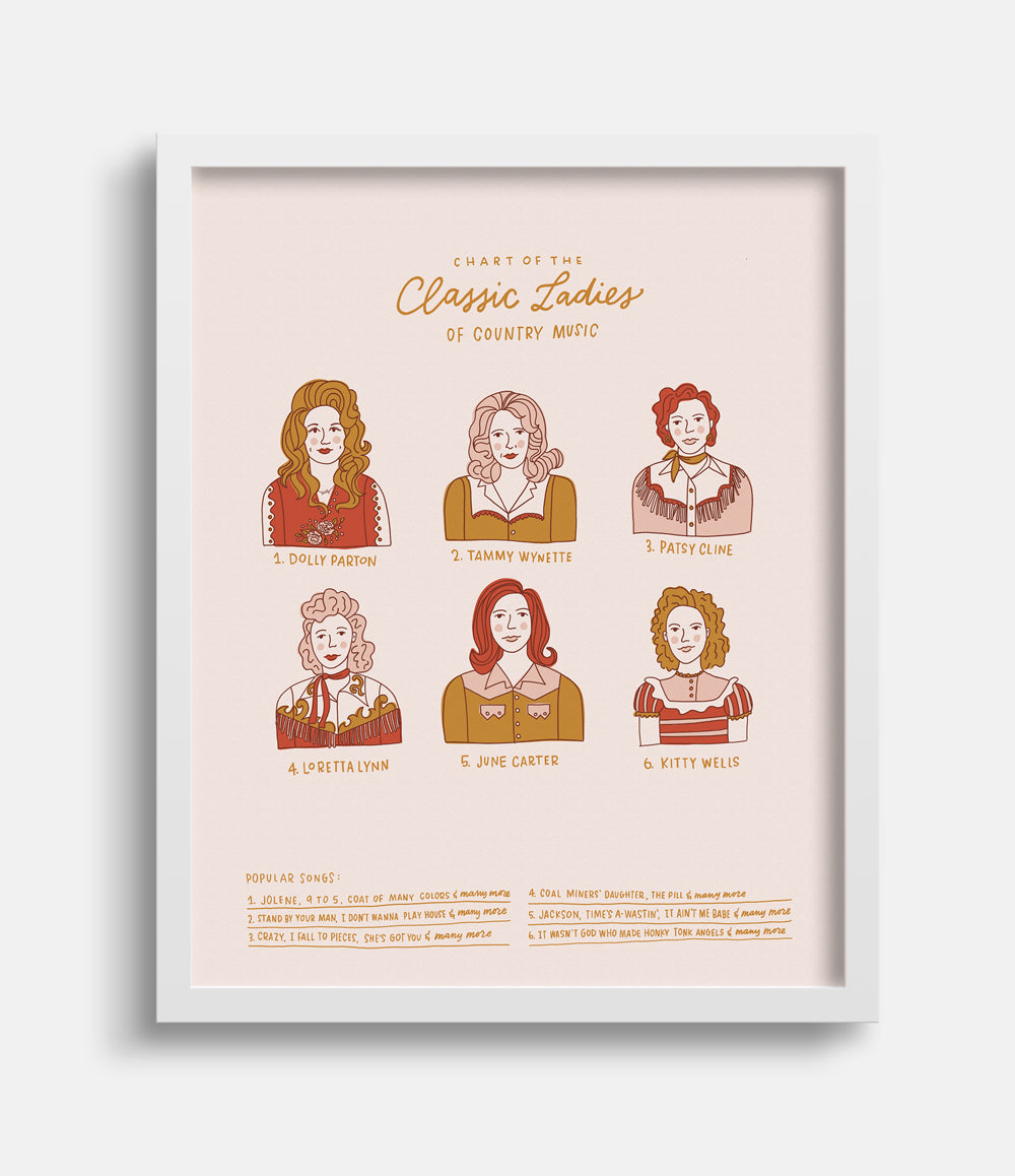 This illustrated chart celebrates the classic female singers of country music. The print includes 6 portraits and a list of each artists top songs.