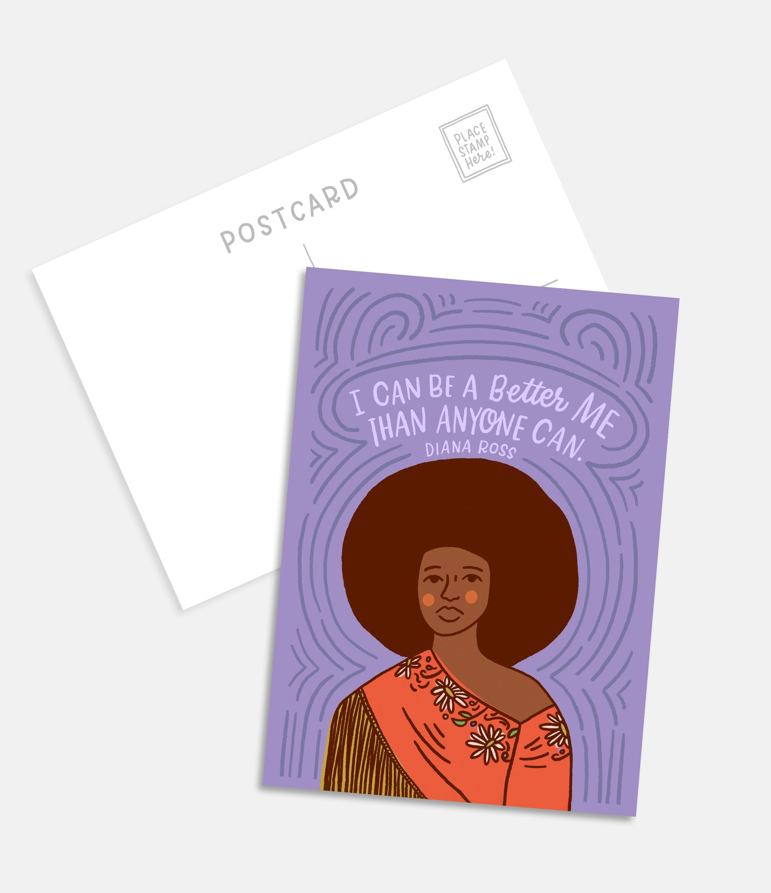 This brightly illustrated postcard features a playful illustration of soul singer, Diana Ross, paired with a hand-lettered quote from her. "I can be a better me than anyone can." - Diana Ross. The back of the postcard has space for a personal message and lines to add an address.