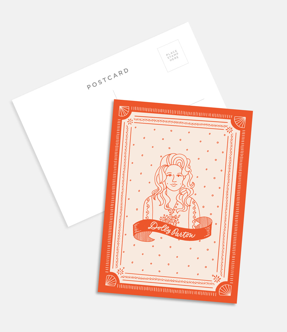 This brightly illustrated postcard features a playful illustration of Dolly Parton. Perfect to send to country music lovers and Dolly Parton fans. The back of the postcard has space for a personal message and lines to add an address.